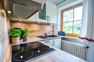 • Komplett ausgestattete Wohnküche mit Backofen, Spülmaschine, Kühlschrank, Eierkocher, Wasserkocher, Toaster, Kaffeemaschine